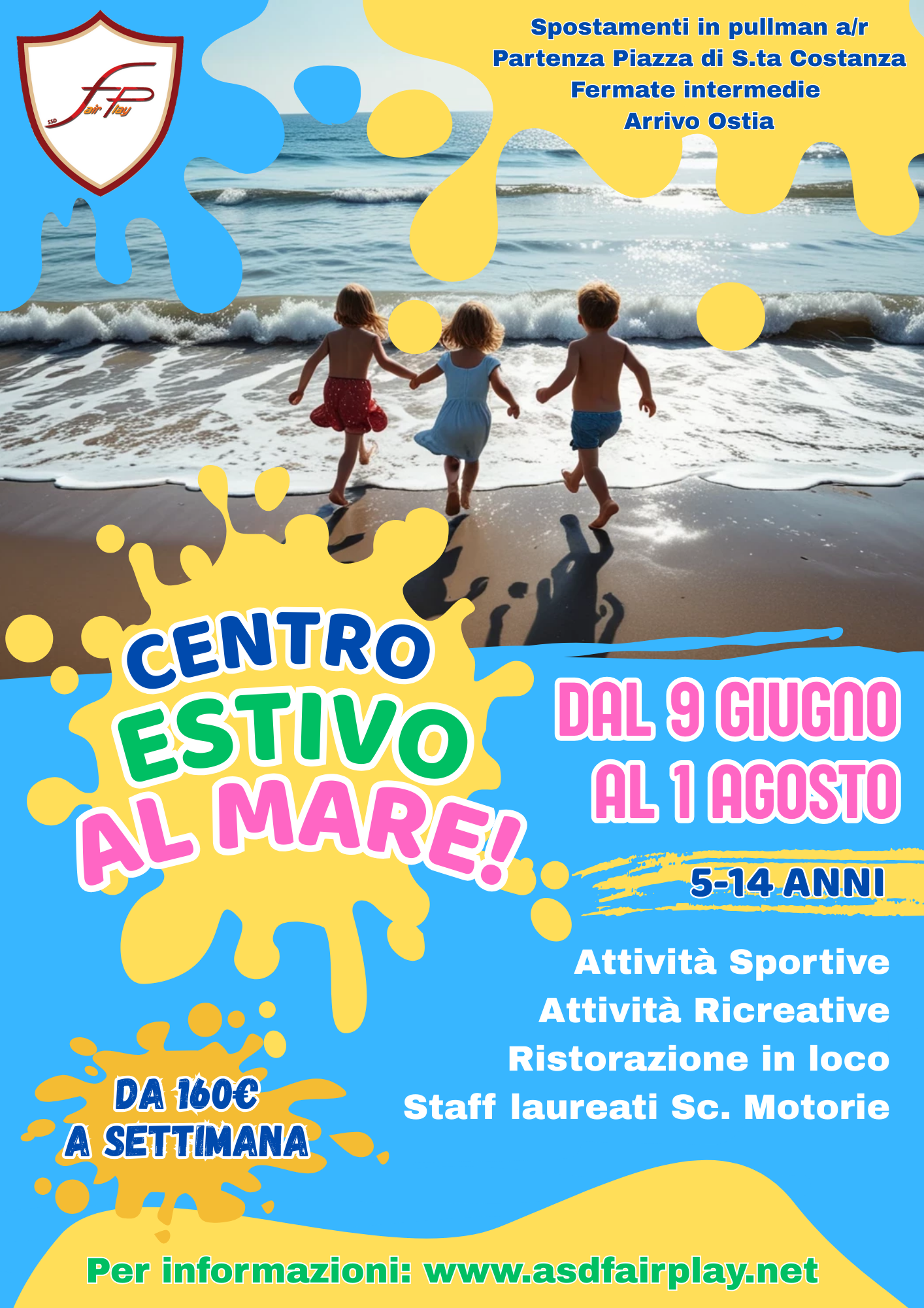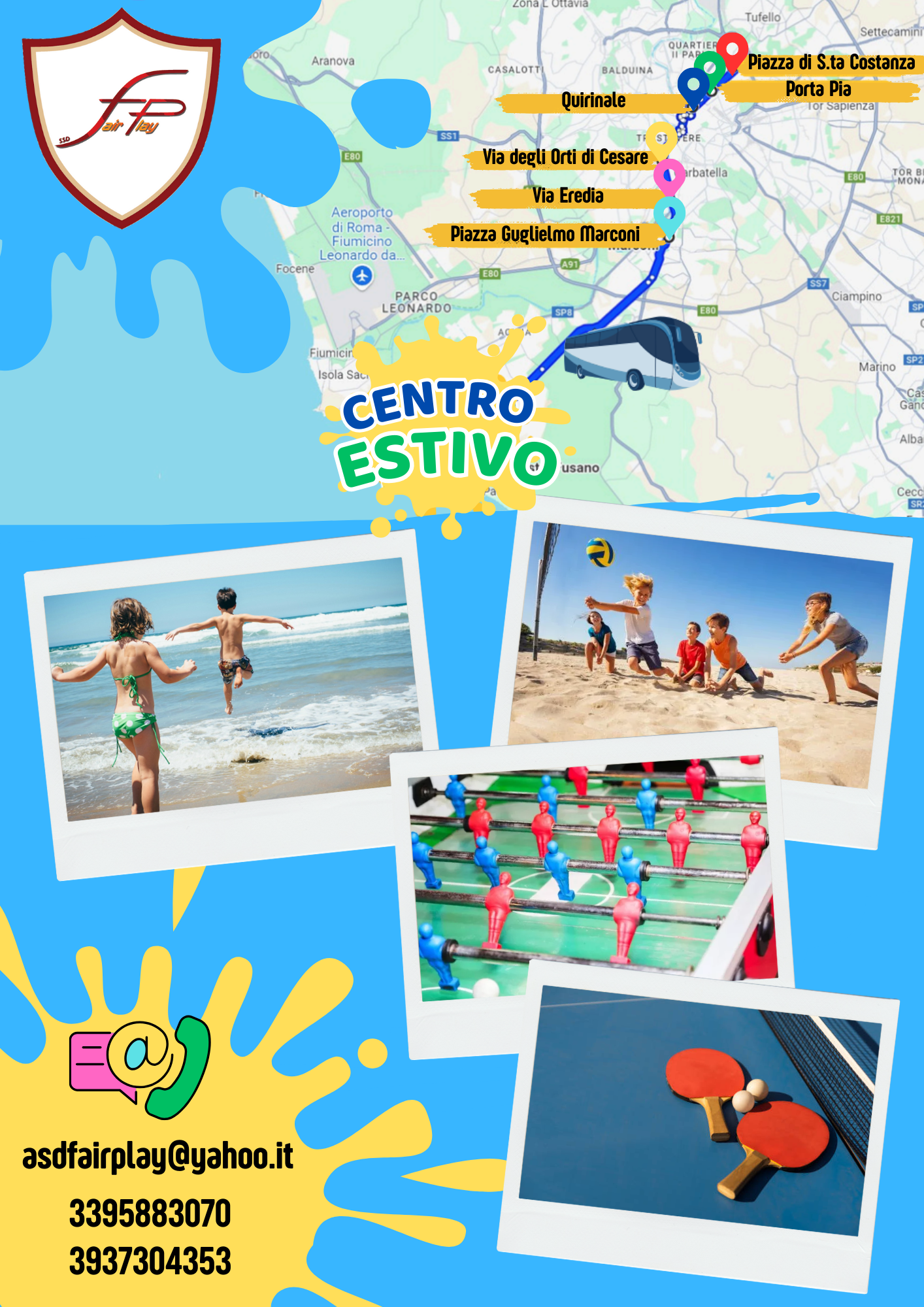 Nella primavera del 2009, a soli 6 mesi dalla sua fondazione, la Fair Play si propone come società a cui affidare la gestione del centro estivo organizzato presso la struttura del Maximo Club in zona Bufalotta. Sarà stato per l’ottimo staff presentato di tutti laureati in Scienze Motorie, sarà stato per la bontà del progetto…ma la proposta venne accettato dalla proprietà del Maximo Club e iniziò la storia dei centri estivi gestiti dalla Fair Play. Fu subito un successo…già in quella prima stagione vennero raggiunti numeri molto superiori alle attese sia della Fair Play che della stessa struttura il che portò a una conferma immediata anche per la stagione successiva. L’estate del 2010 fu la stagione della svolta in quanto furono superate per la prima volta quota 100 presenze giornaliere (record assoluto per quel centro) e soprattutto la Fair Play venne chiamata per gestire per il 2011 il Centro Estivo dei Dipendenti del Quirinale a Castelporziano. Una responsabilità enorme alla quale la Fair Play rispose rispettando le attese…