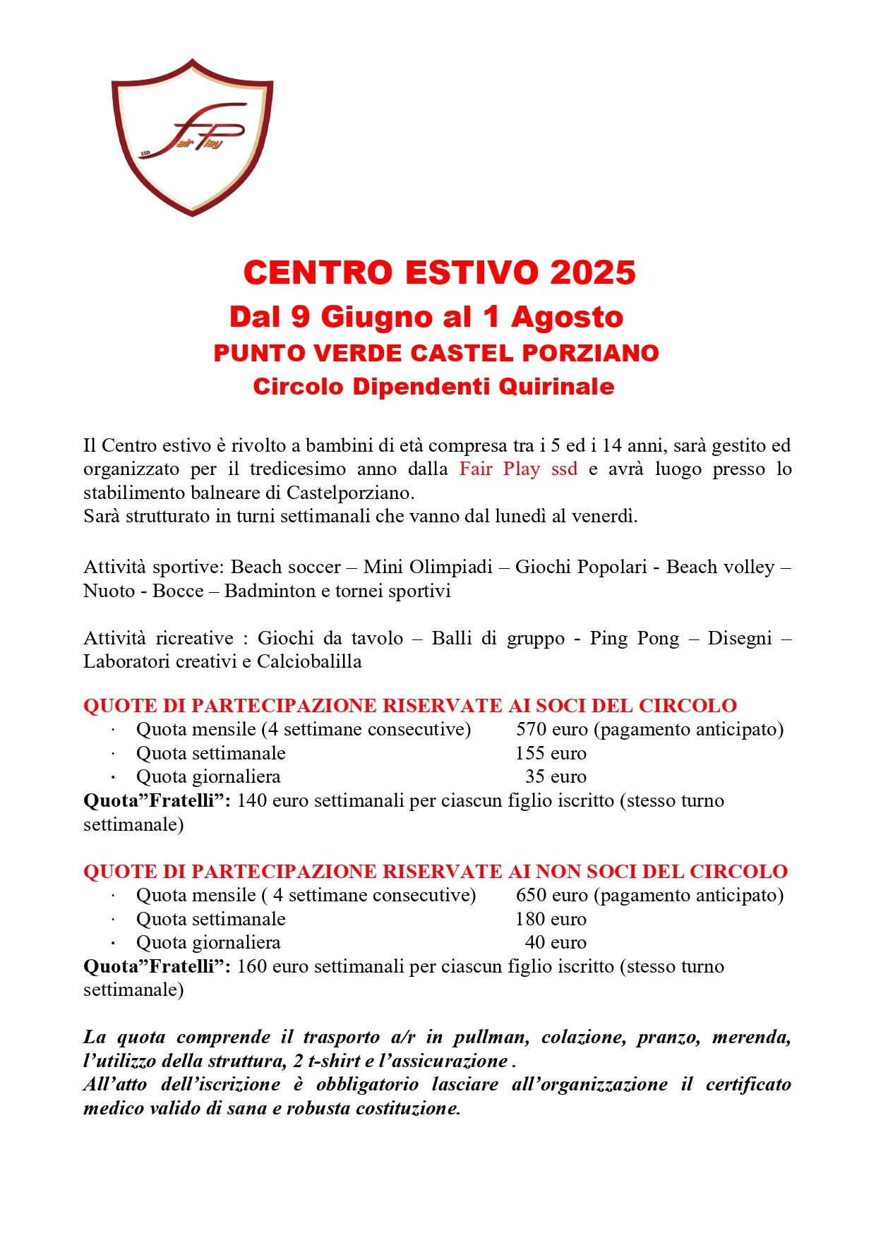 Dal 2019 la Fair Play organizza il suo centro estivo esclusivamente all’interno del Circolo Dipendenti del Quirinale a Castelporziano.